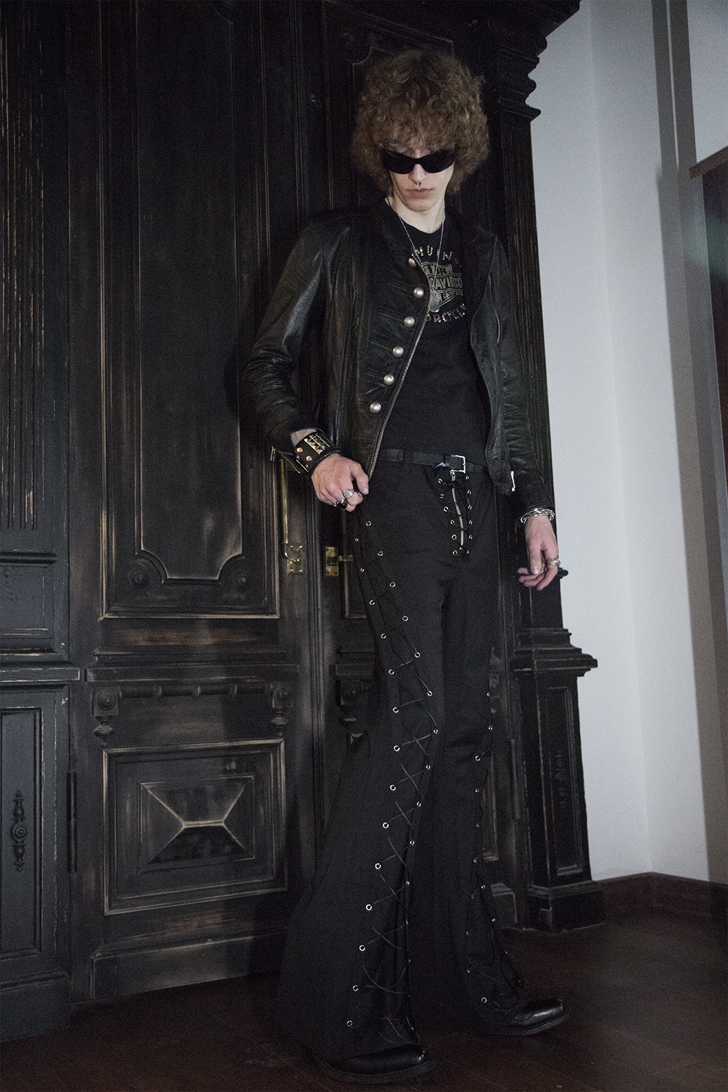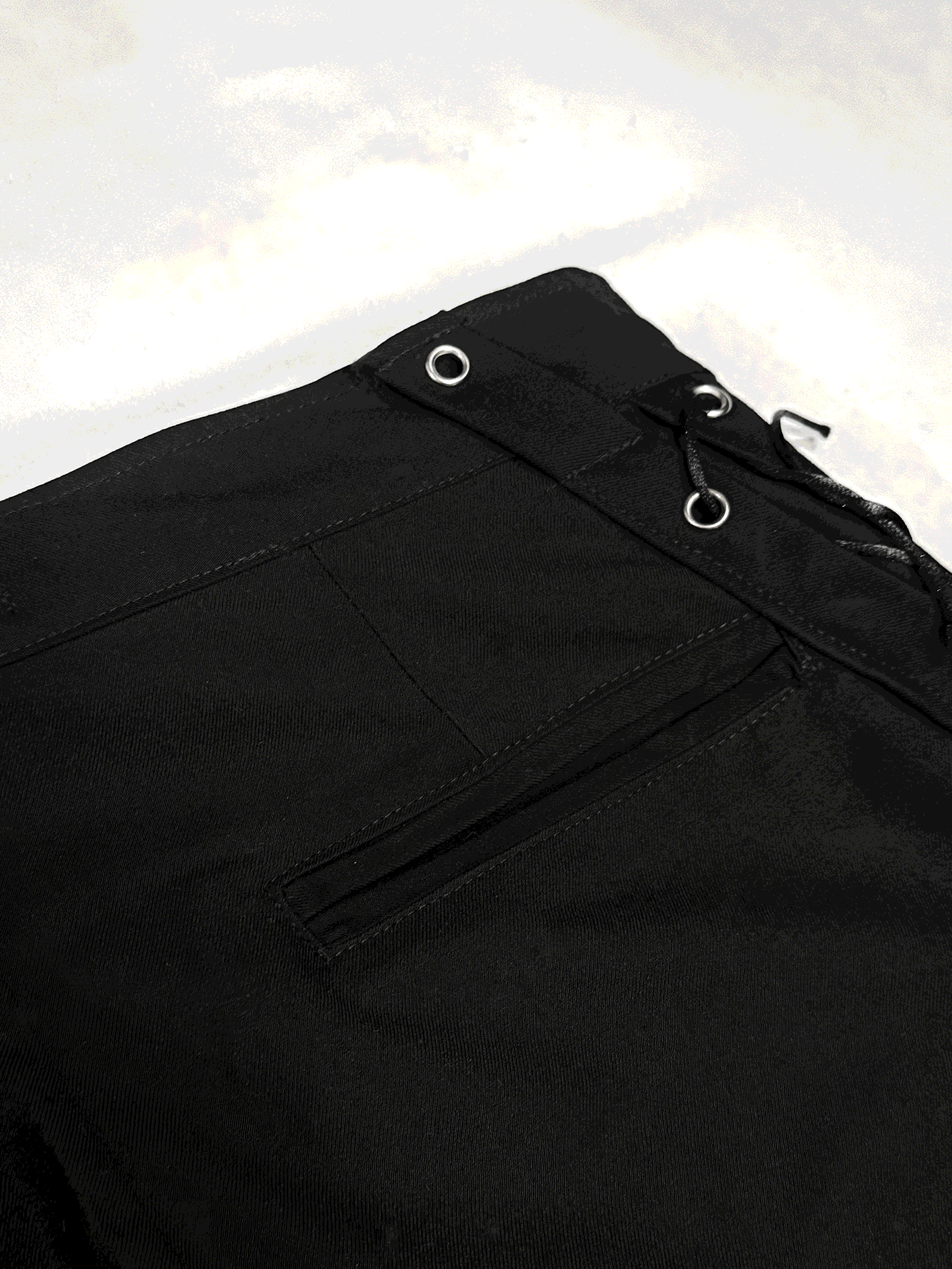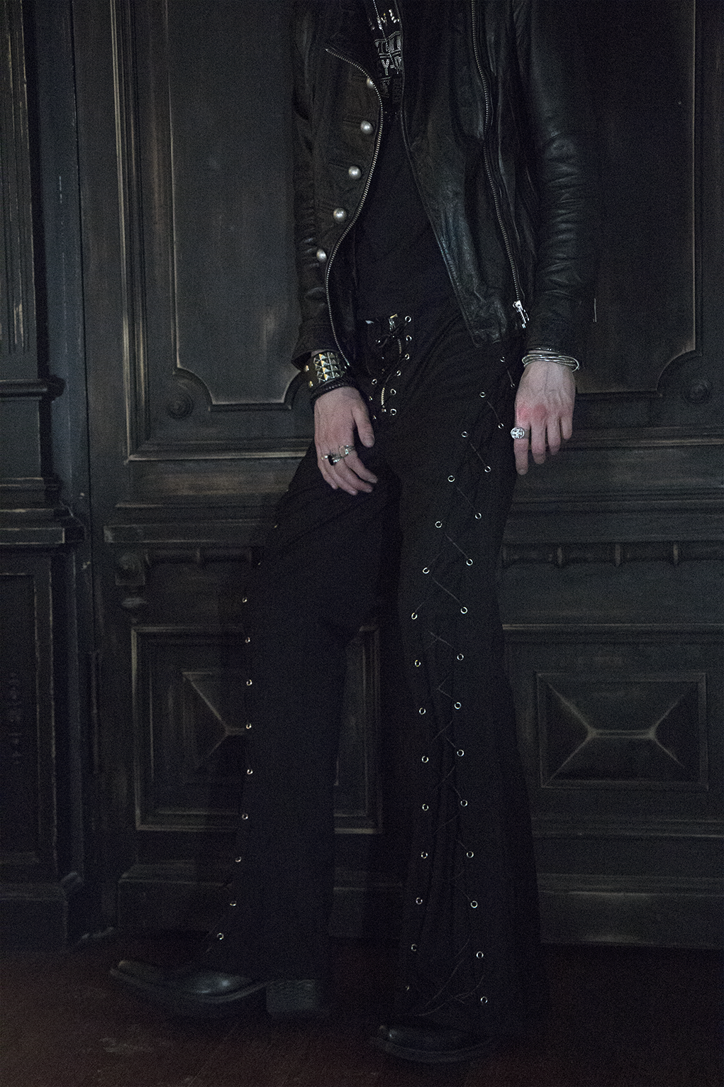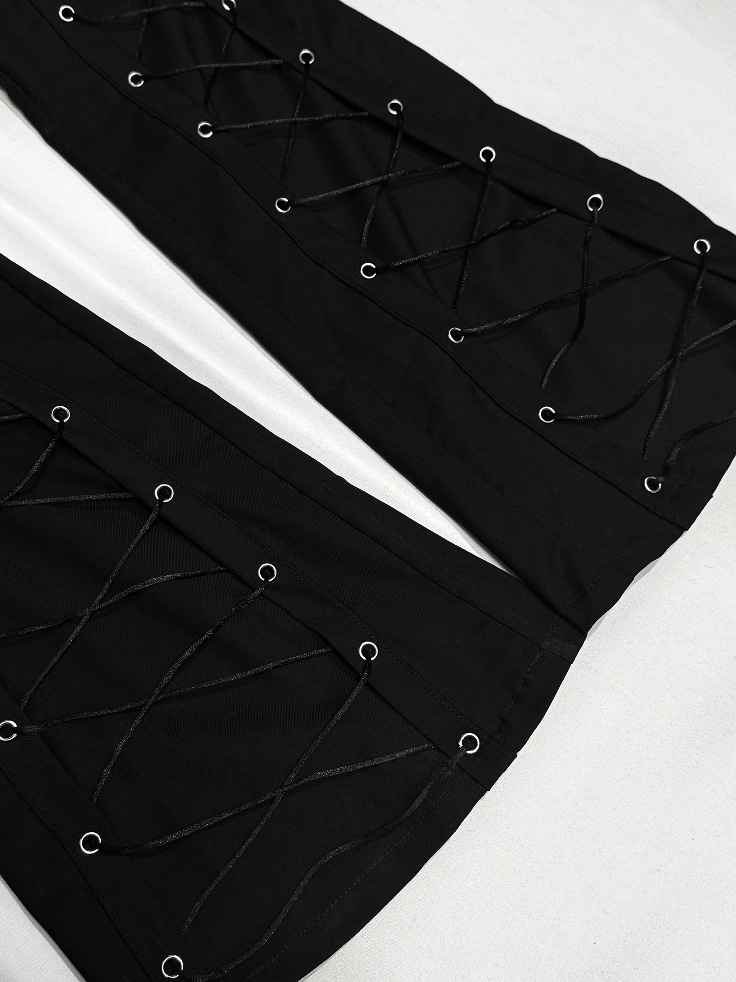 Брюки мужские Flare of void - Клёш пустоты Шнуровка идёт строго вниз и теряется в расширенном к низу силуэте, который напоминает пустоту - это строгая форма, растворяющаяся в тишине