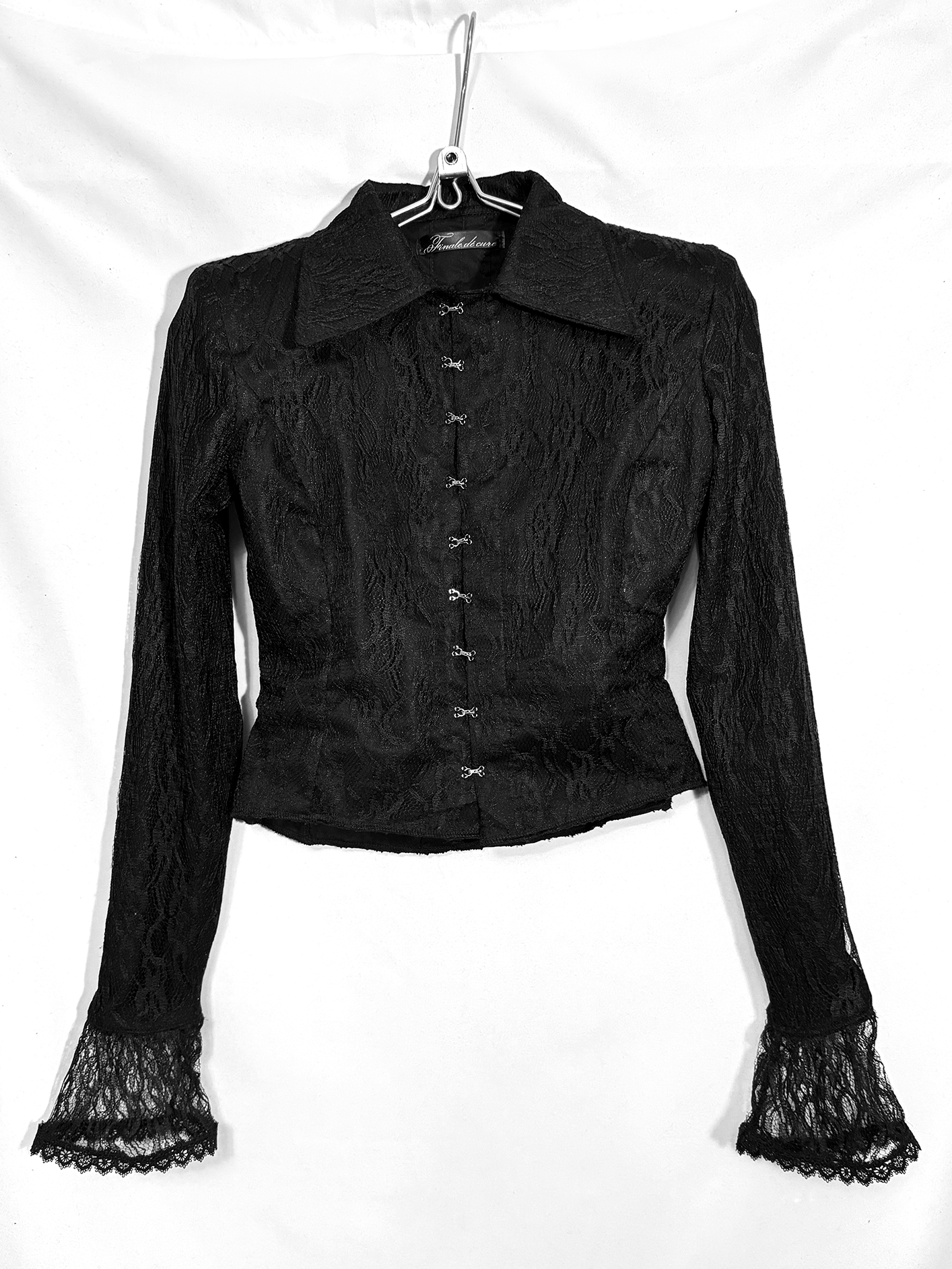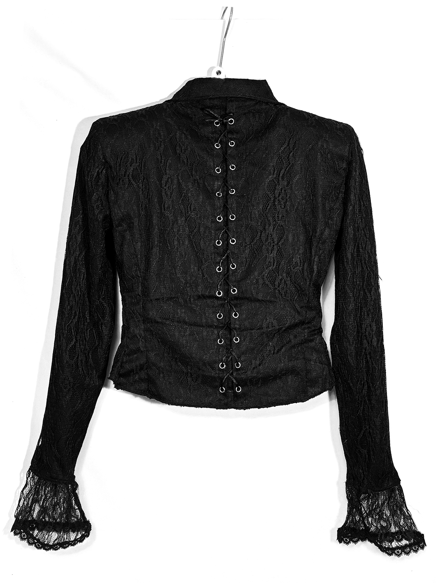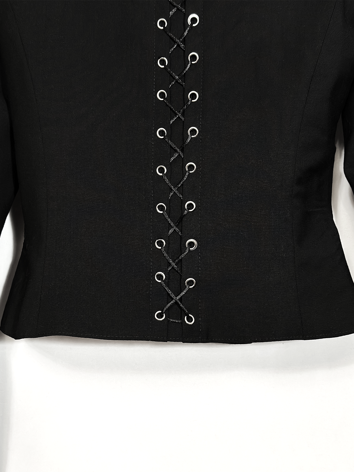 Детали: · Двухслойная: основа из 100% хлопка, поверх - кружево(100% пэ), не просвечивает · Приталенный силуэт Шнуровка вдоль позвоночника · Застёжка спереди на металлические крючки · Воротник-стойка с удлиненными острыми уголками · Длинные рукава: основная часть непрозрачная, на манжете - кружевное расширение · Можно выбрать с объёмными подплечниками (строгий силуэт) или без них · Глубокий черный цвет