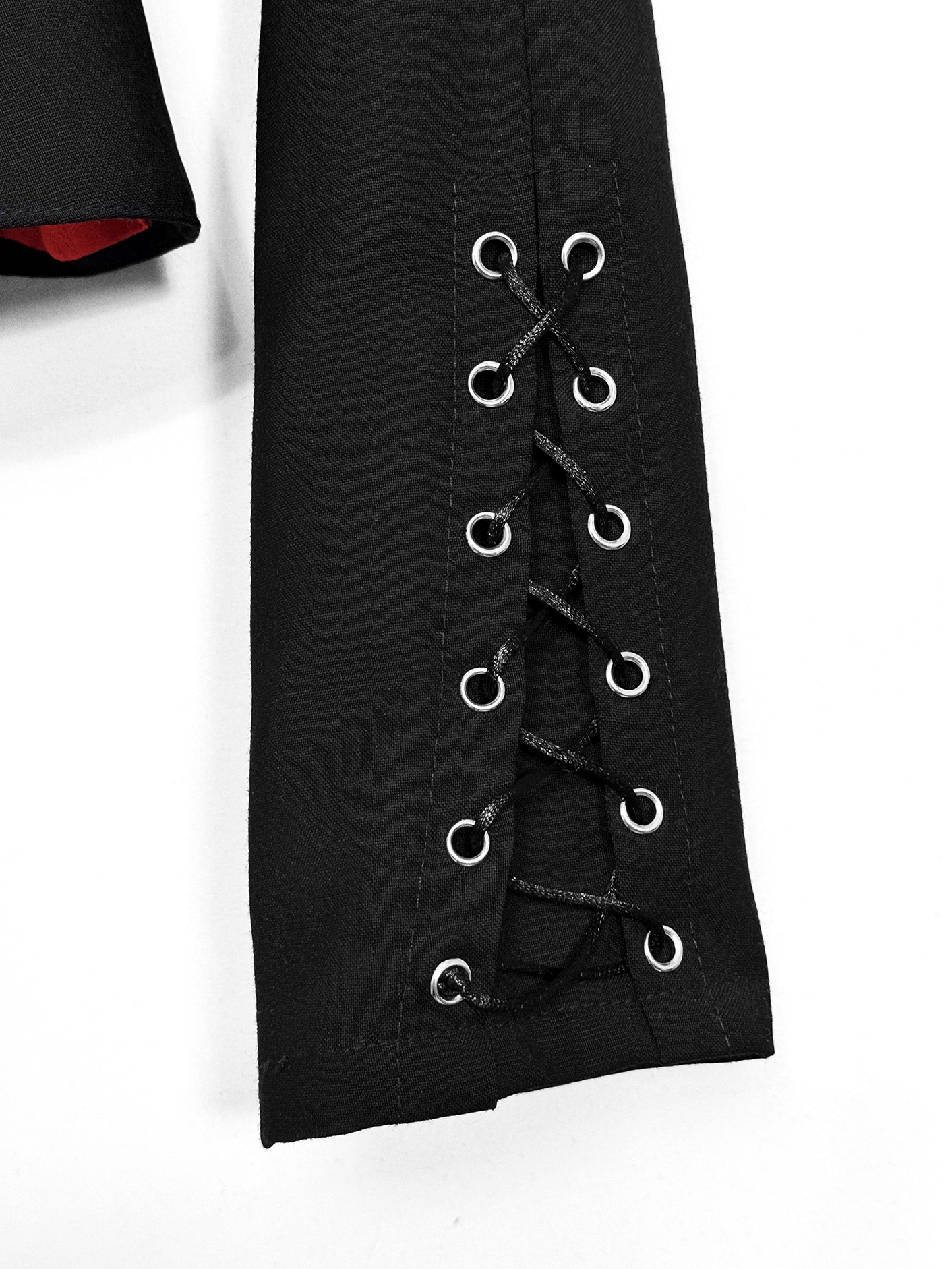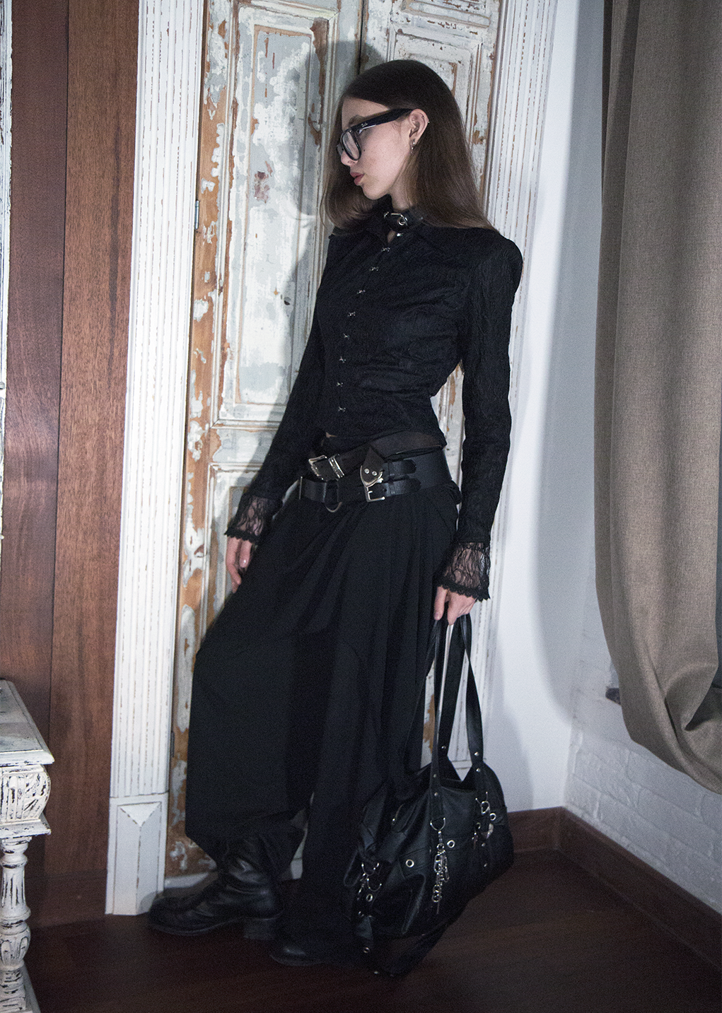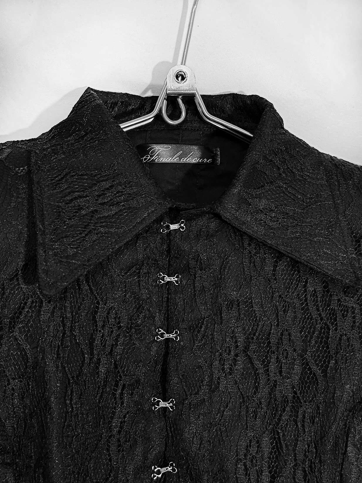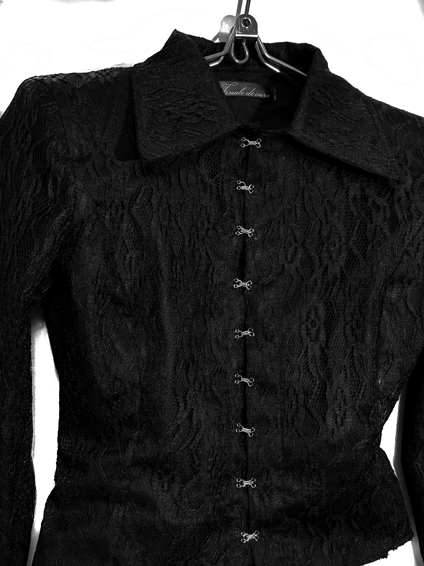 Детали: · Двухслойная: основа из 100% хлопка, поверх - кружево(100% пэ), не просвечивает · Приталенный силуэт Шнуровка вдоль позвоночника · Застёжка спереди на металлические крючки · Воротник-стойка с удлиненными острыми уголками · Длинные рукава: основная часть непрозрачная, на манжете - кружевное расширение · Можно выбрать с объёмными подплечниками (строгий силуэт) или без них · Глубокий черный цвет