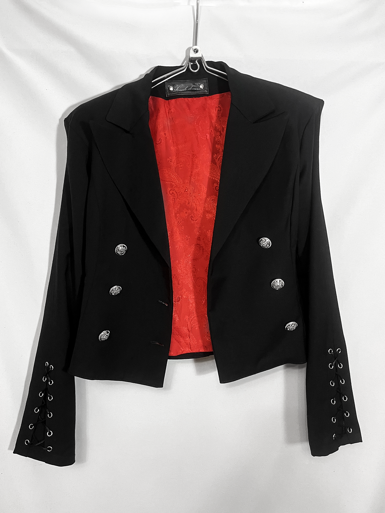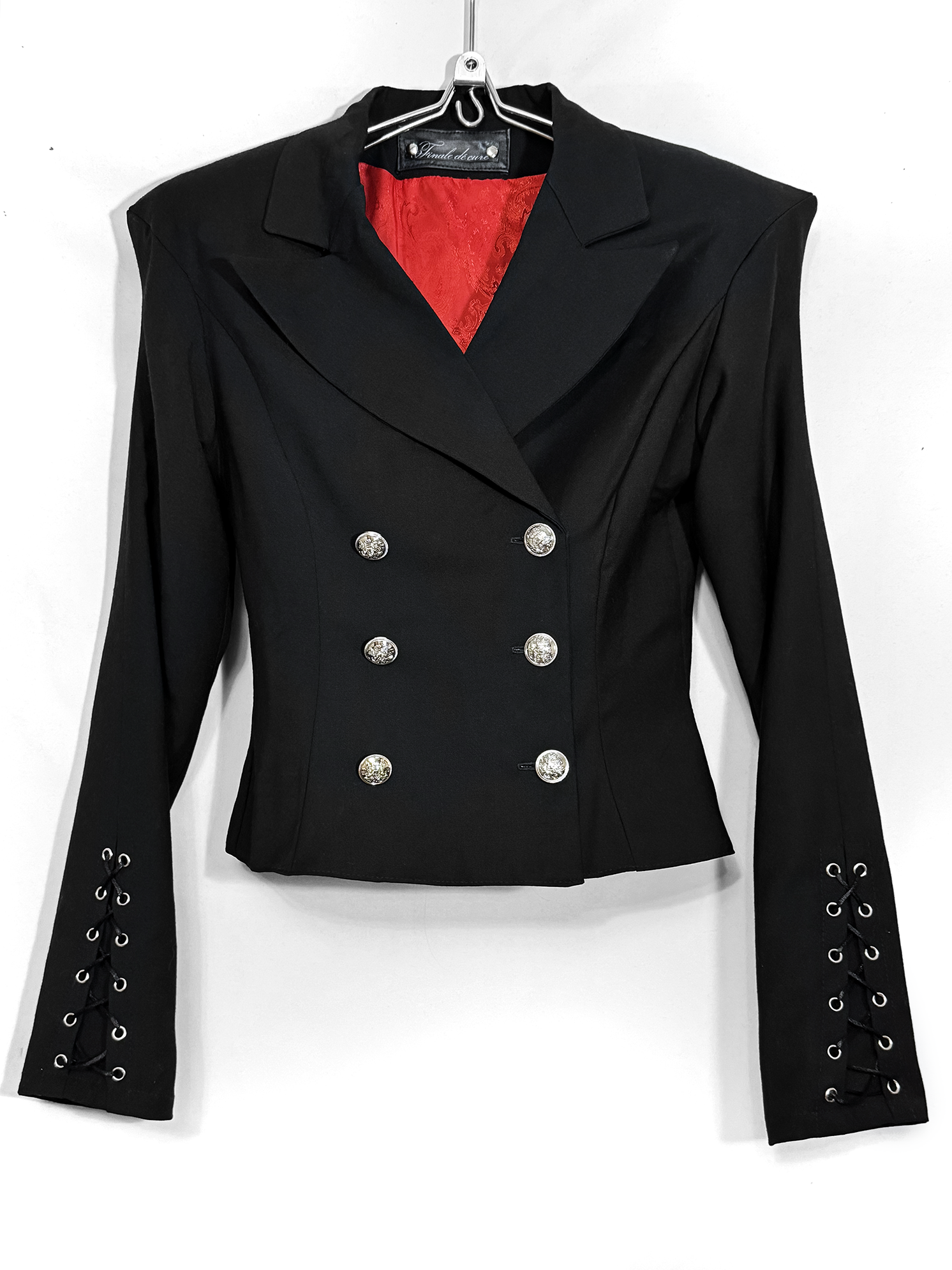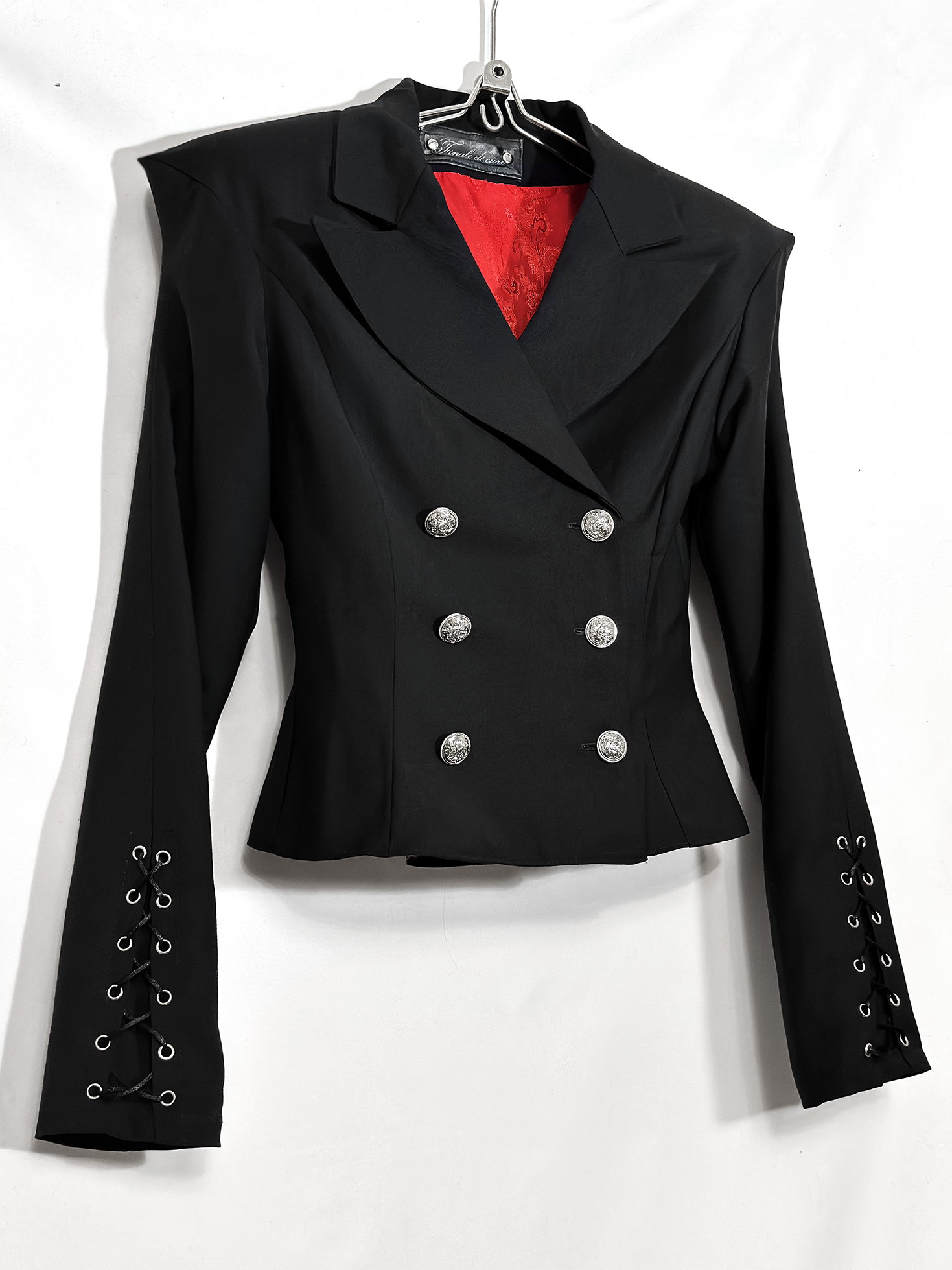 Детали: · Острые плечи (вшиты объёмные подплечники, которые держат форму) · Приталенный силуэт · Шнуровка внизу рукавов и по спине вдоль позвоночника · Широкие острые лацканы · Красный подклад Материал: костюмная ткань (66% ПЭ, 30% вискоза, 4% эластан) Подклад: вискоза + пэ, не электризуется!
