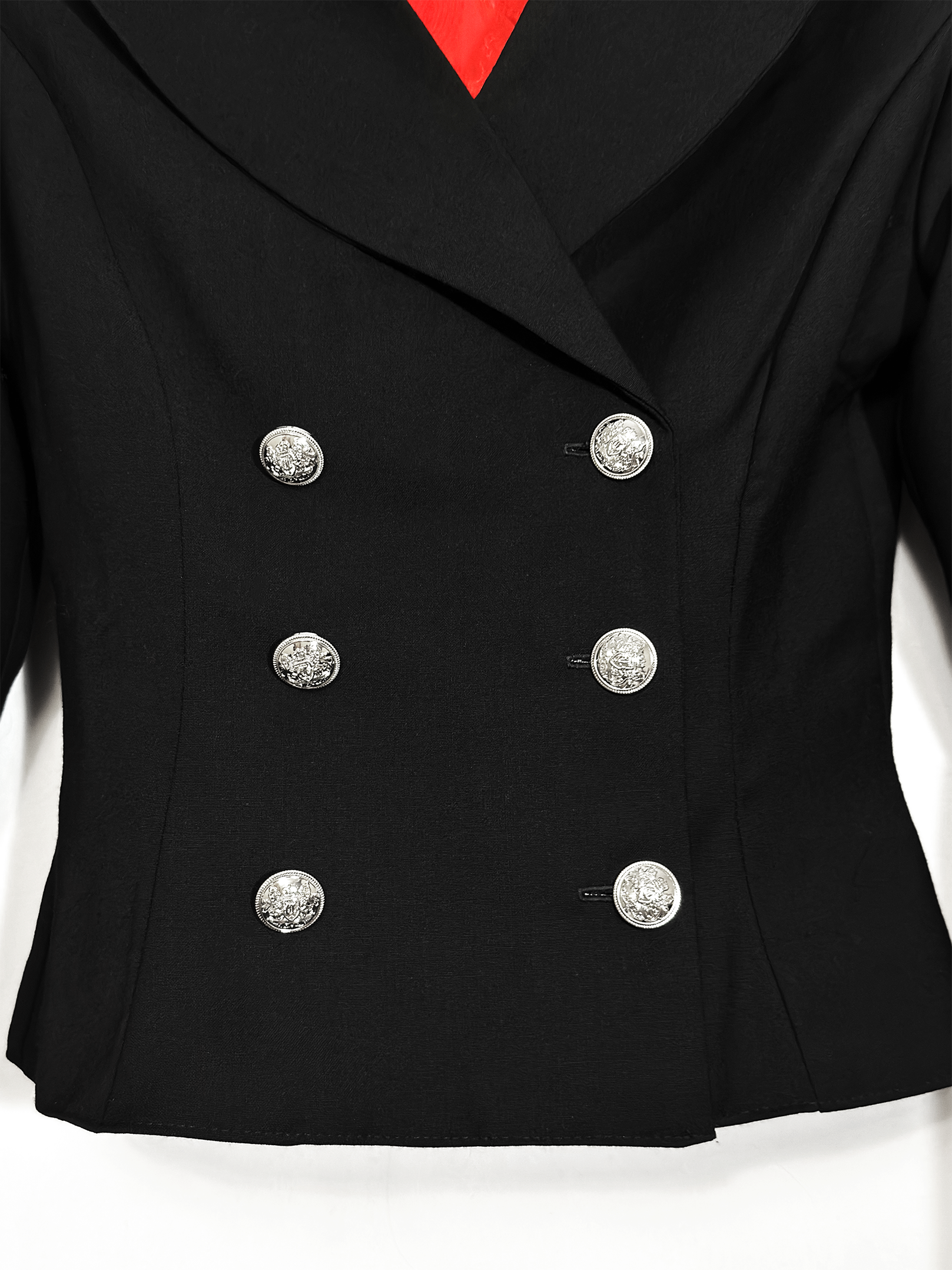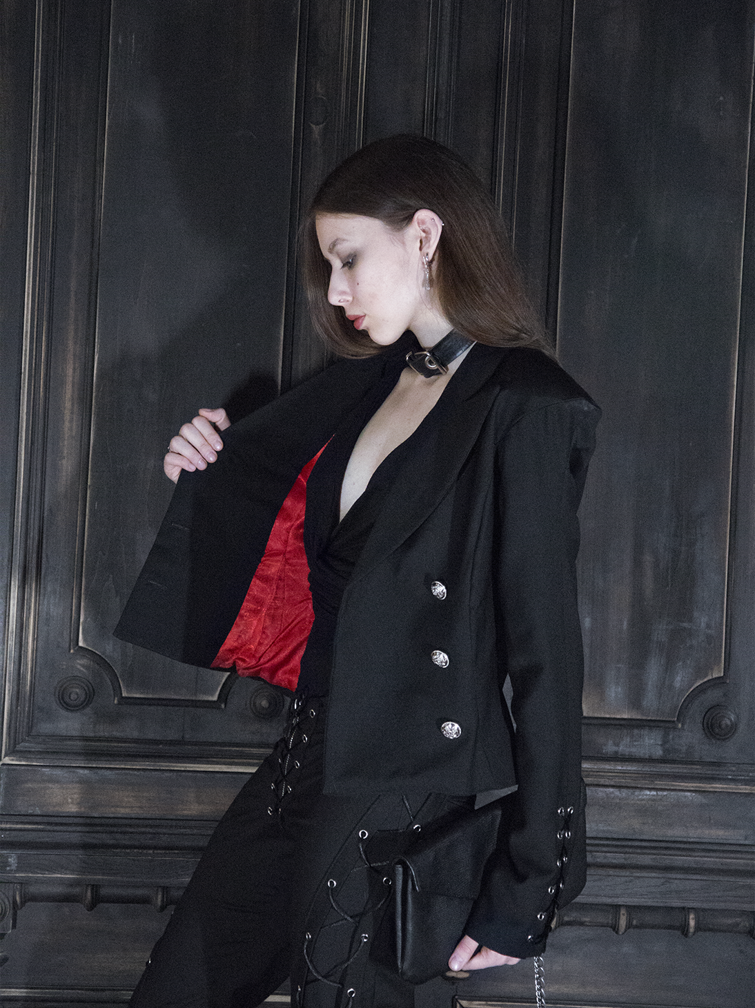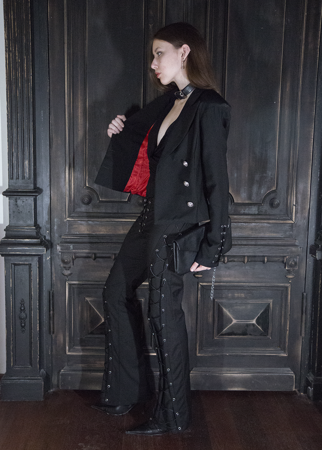 Детали: · Острые плечи (вшиты объёмные подплечники, которые держат форму) · Приталенный силуэт · Шнуровка внизу рукавов и по спине вдоль позвоночника · Широкие острые лацканы · Красный подклад Материал: костюмная ткань (66% ПЭ, 30% вискоза, 4% эластан) Подклад: вискоза + пэ, не электризуется!