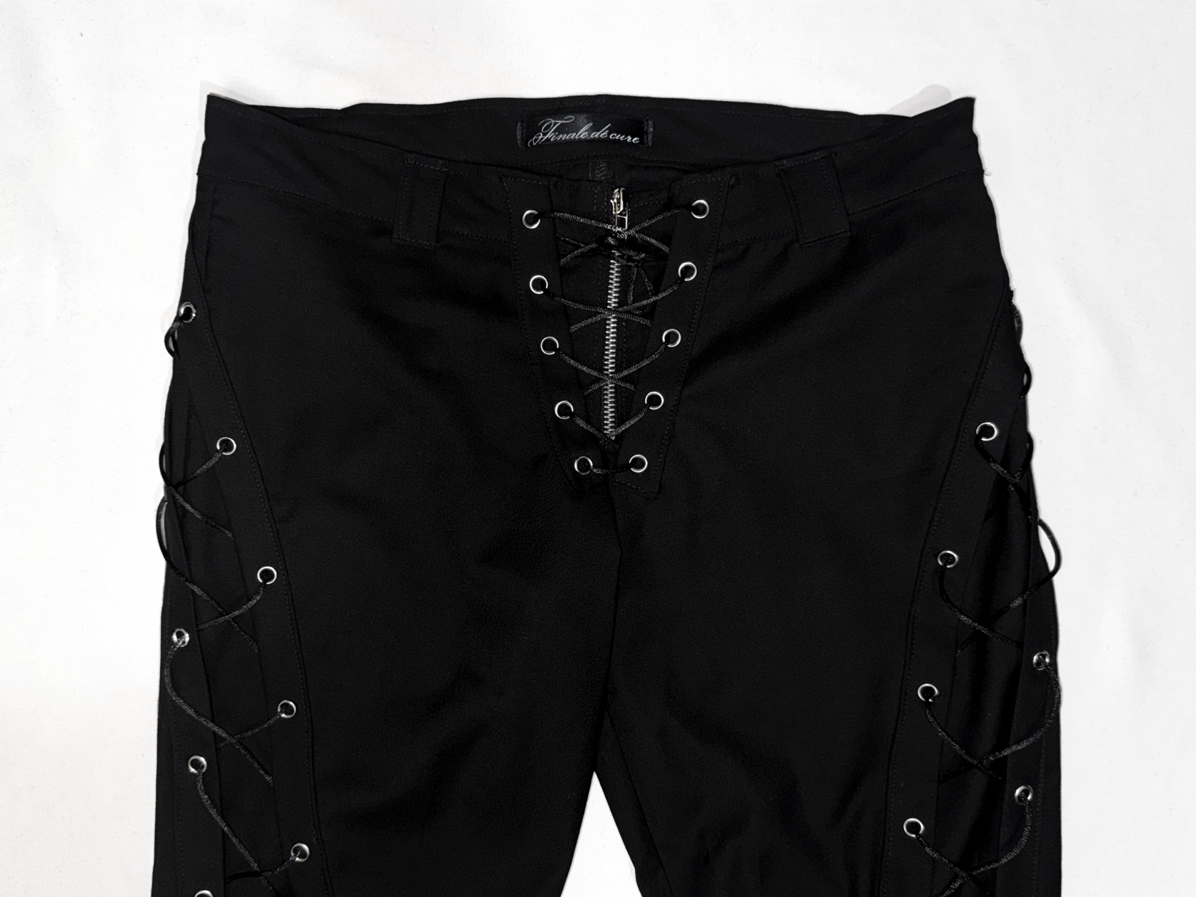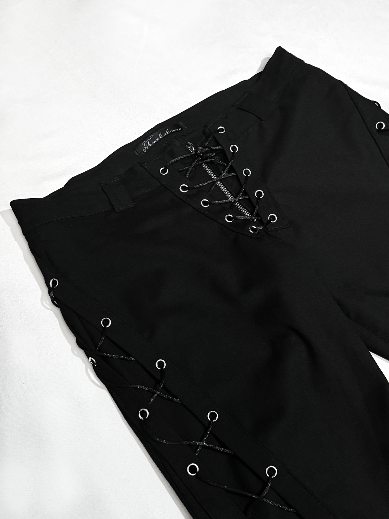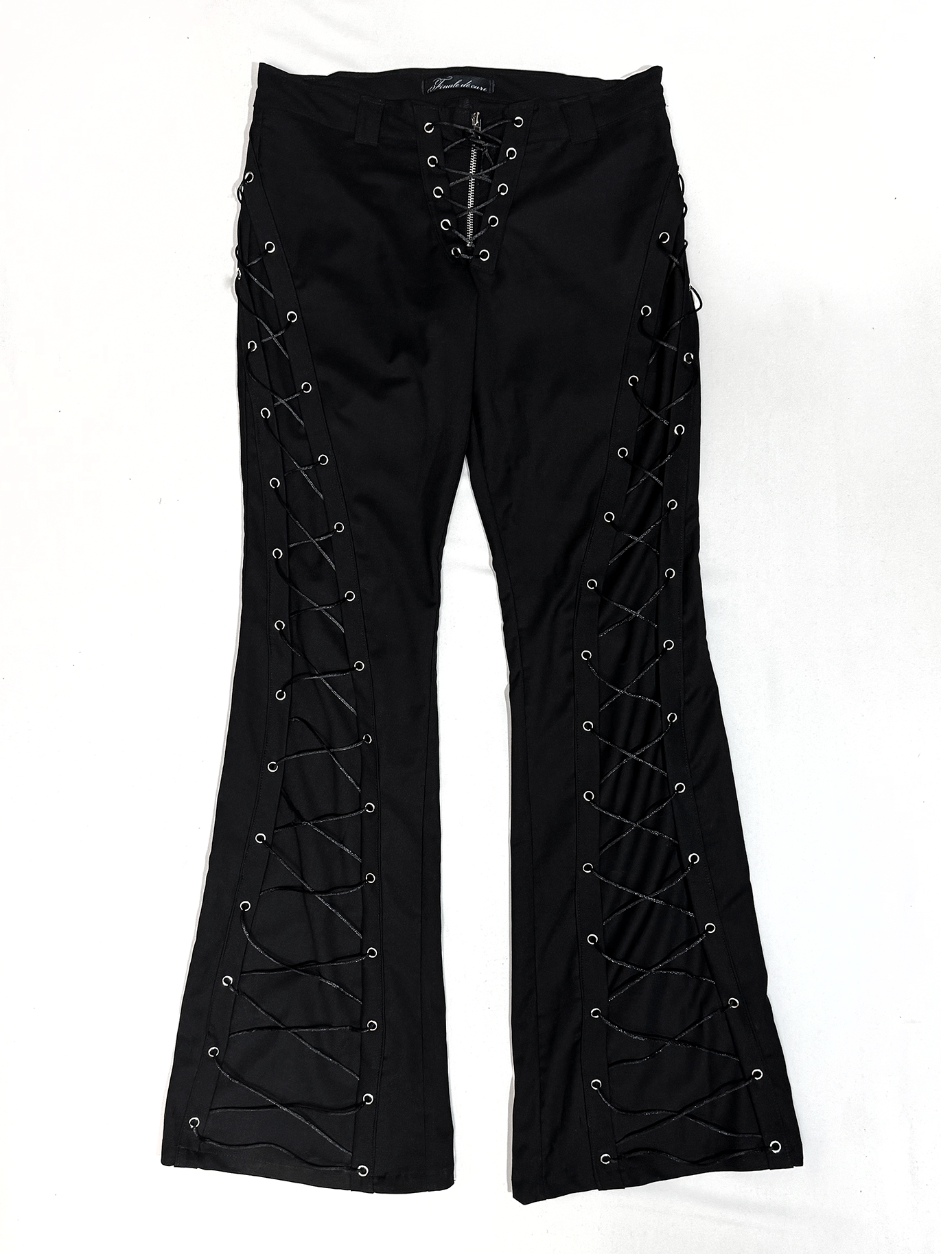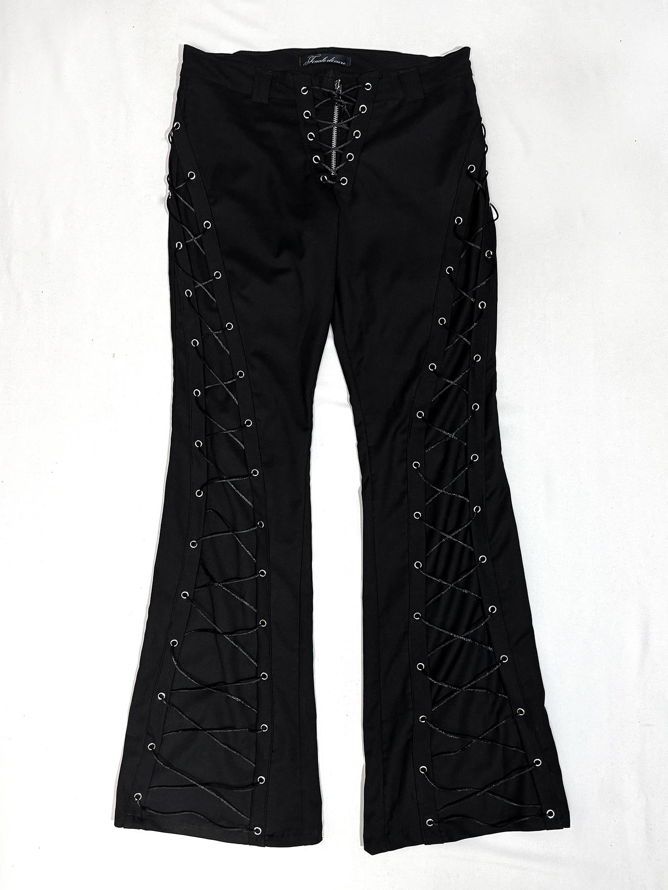Брюки женские Flare of void - Клёш пустоты Шнуровка идёт строго вниз и теряется в расширенном к низу силуэте, который напоминает пустоту - это строгая форма, растворяющаяся в тишине