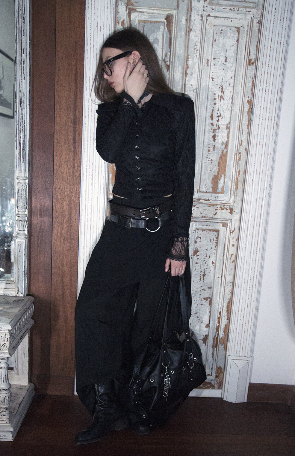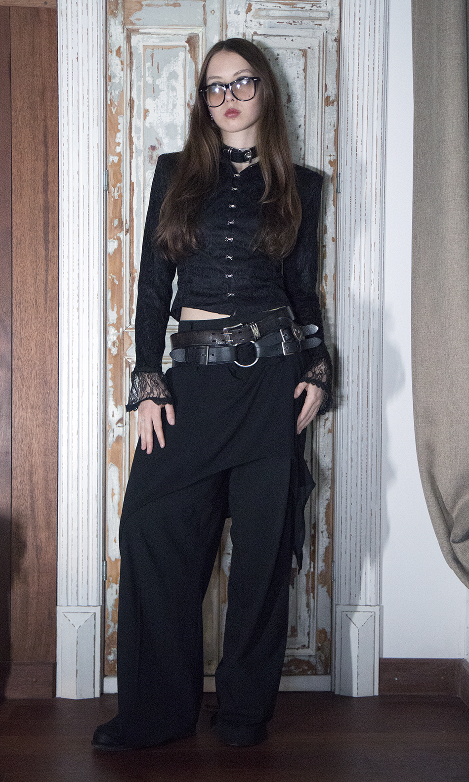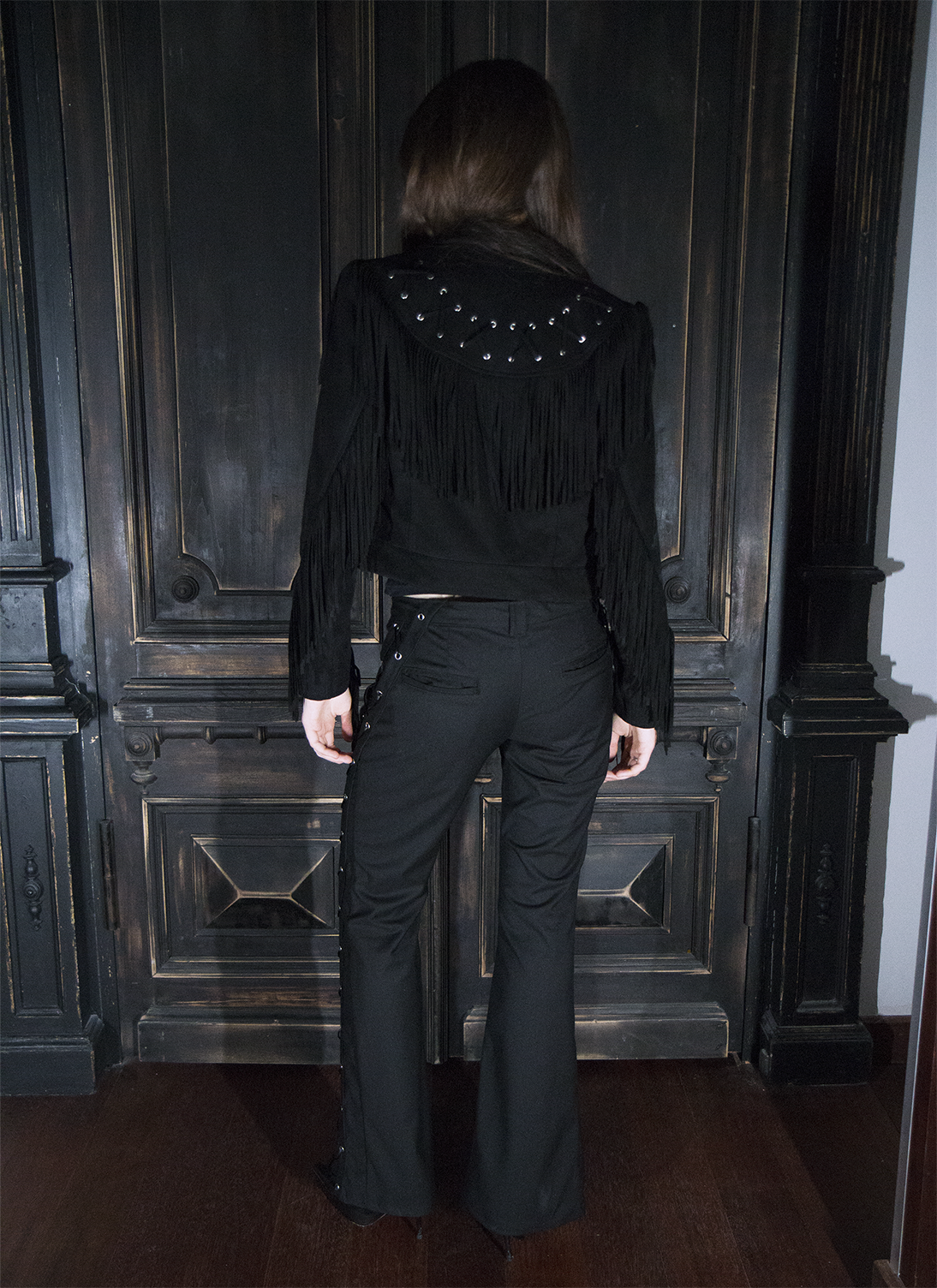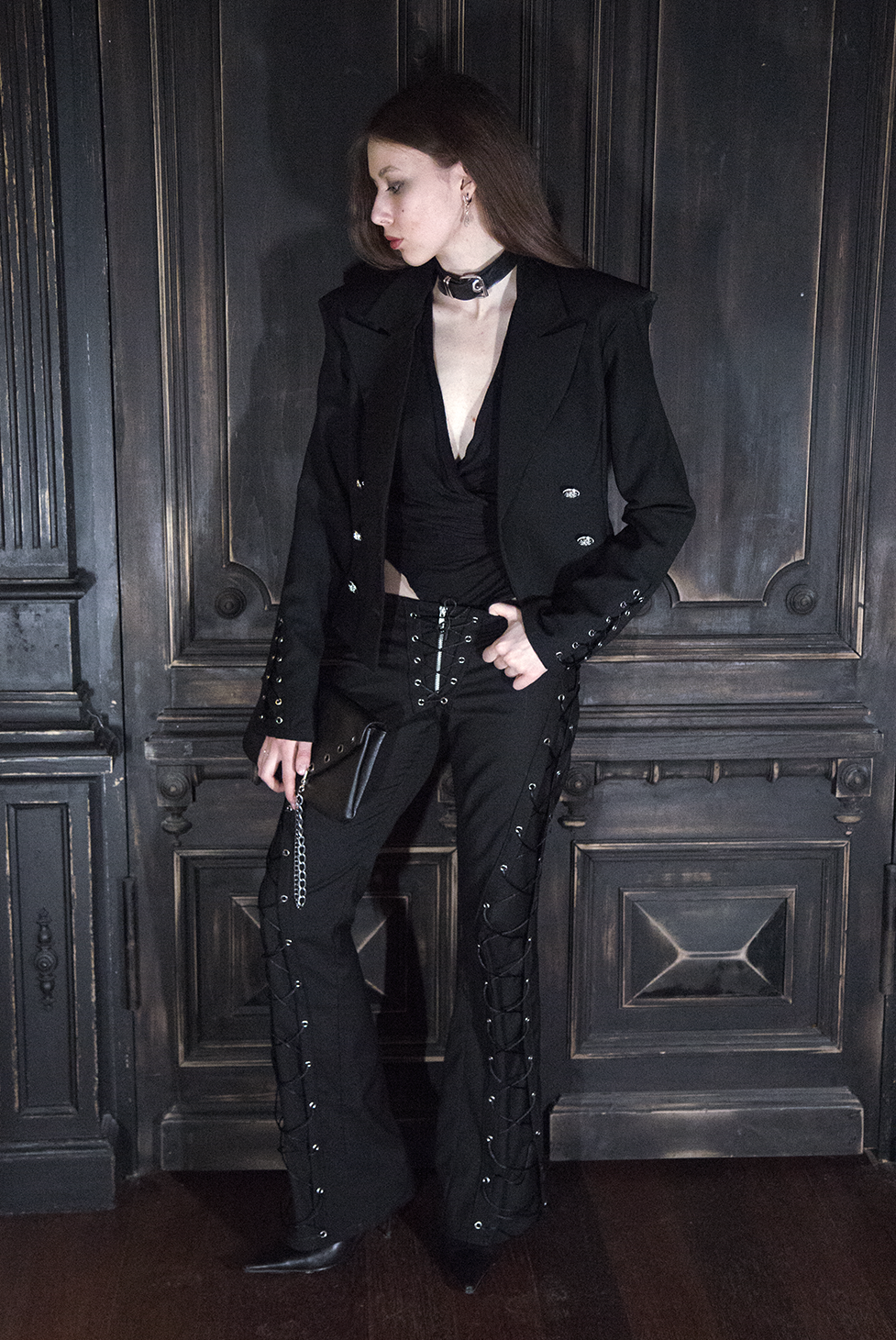 Брюки женские Flare of void - Клёш пустоты Шнуровка идёт строго вниз и теряется в расширенном к низу силуэте, который напоминает пустоту - это строгая форма, растворяющаяся в тишине