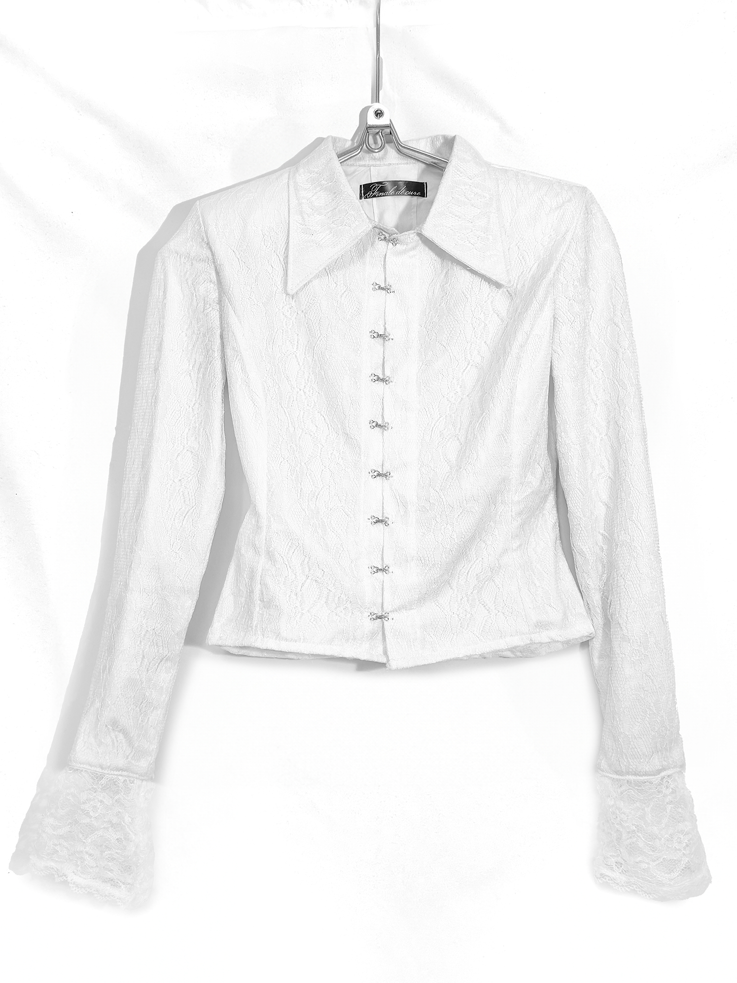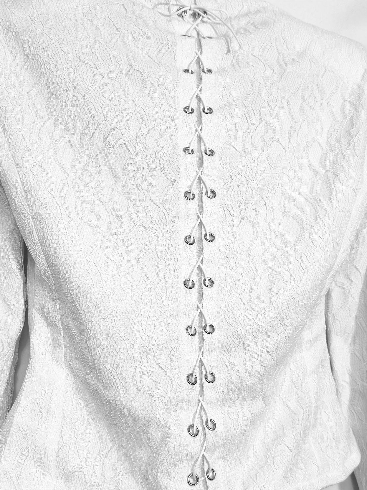 Детали: · Двухслойная: основа из 100% хлопка, поверх - кружево(100% пэ), не просвечивает · Приталенный силуэт Шнуровка вдоль позвоночника · Застёжка спереди на металлические крючки · Воротник-стойка с удлиненными острыми уголками · Длинные рукава: основная часть непрозрачная, на манжете - кружевное расширение · Можно выбрать с объёмными подплечниками (строгий силуэт) или без них · Холодный белый цвет